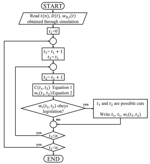 C is the amount of cachaça (kg), D is the total amount of distillate generated until the selected time, and and correspond to the selected time for the first and second cuts, respectively. The subscript D is related to the distillate, and i to the compound. The cachaça composition (wD,i) was tested for every pair t1 and t2, as described in the algorithm (Figure 2): if the composition obeyed the Brazilian legislation (Table 2), the data set was stored in a file for further analysis.