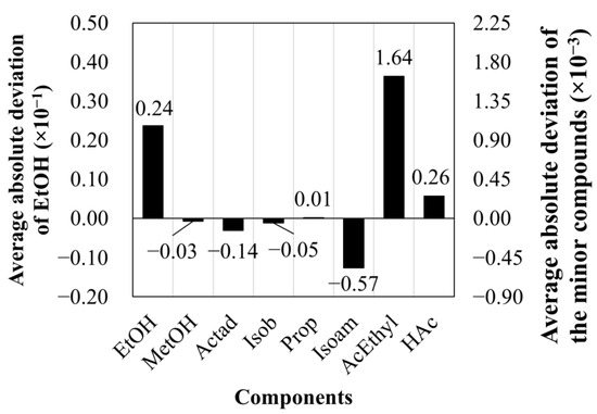 The average absolute deviation between simulated and experimental data for the eight studied compounds (% w/w). EtOH = ethanol, MetOH = methanol, Actad = acetaldehyde, Isob = isobutanol, Prop = n-propanol, Isoam = Isoamyl alcohol, AcEthyl = Ethyl acetate, HAc = Acetic acid.