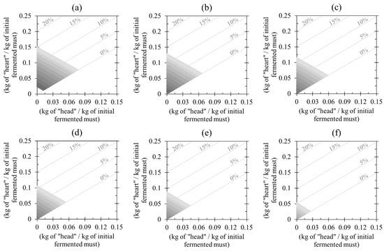 Cut ranges as a function of the ethanolic concentration of the distillate for each composition constructed without analyzing the concentrations of minority components. Fermented must (Mass fraction of ethanol): (a) c1 (7.25) (b) c7 (6.81) (c) c12 (6.54) (d) c16 (6.36) (e) c20 (6.00) (f) c23 (5.39). The grey scale varied with ethanol concentration, from 38% (v/v) (light) to 48% (v/v) (dark), dotted lines represent the yields.
