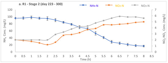 Moreover, performance of ammonium removal in R2 based on kinetic tests is demonstrated in Figure 8b for the entire 60 days of the third stage. Due to the similarity and the disintegration of granules occurring in R2, it was expected that performance of R2 in terms of ammonium removal will be minimized compared to R1. The average NH4-N concentrations in the effluent of R2 have been estimated at 24.3 ± 6.3 mg/L. In addition, a significant rise in the concentrations of nitrate, as well as slight increase in nitrite concentrations during aerobic phase was noticed, which led to nitrite/nitrate accumulation. Effluent concentrations of nitrate were between 46 and 50 mg/L, while it was 10 mg/L for nitrite. For R1 (Figure 8a), the average NH4-N concentrations in the effluent were about 12.41 ± 3.3 mg/L.