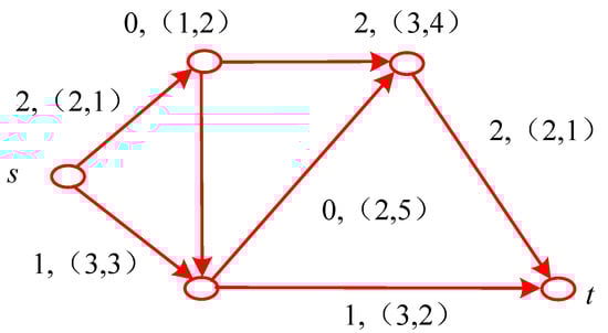 Therefore, the capacity-cost network can be represented by the network. Similarly to the maximum flow network, the definition of the feasible flow of the capacity-cost network is as follows, set a flow on the network as , and satisfy Equation (6) at the same time.