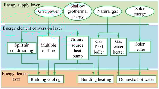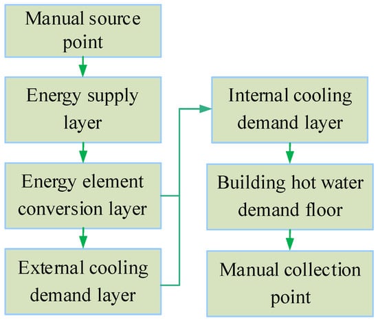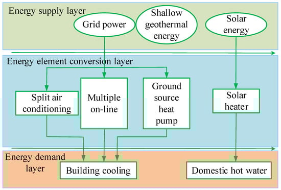 Based on the network flow theory, referring to the relevant regulations on the conversion, distribution and consumption of building energy in China, the network flow theory is applied to solve the energy circulation of regional building energy system, the network flow theory is introduced into the regional building energy planning to construct a regional building energy planning model. In the energy circulation stage of regional buildings, the energy supply layer refers to the types of energy that can be provided in the region, the energy conversion layer refers to the conversion method of all resources, and the energy demand layer refers to considering the hot water, heating, and air conditioning needs of different types of buildings in the region. The research takes ordinary residential buildings in summer as an example, and the flow diagram of the cooling network of ordinary residential buildings constructed is shown in Figure 3. The forms of energy conversion include split air conditioners, multi-line air conditioners, ground source heat pumps, etc. In the energy supply layer, grid electricity can be used to meet the realization of split air conditioners and online air conditioners, while ground source heat pumps need to use shallow geothermal energy and electricity can be achieved through the joint action of the grid, and domestic hot water can be achieved through solar water heaters. Provided that the elements are connected by straight line segments according to the mutual relationship, finally, the network flow graph is obtained [22,23,24]. Referring to the construction method in Figure 3, the elements of each layer in the summer regional building energy planning are arranged in layers, and the elements between different layers are connected by line segments directed according to the energy flow relationship, from the energy outflow element to the inflow element.