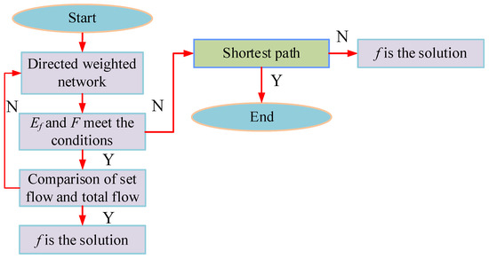 When the formula (12) is satisfied, the second stage is entered. The shortest path from the starting point to the end point in all directed weighted networks is , if it exists , the process is terminated, otherwise the solution is . In the second stage, Equations (13) and (14) need to be satisfied.