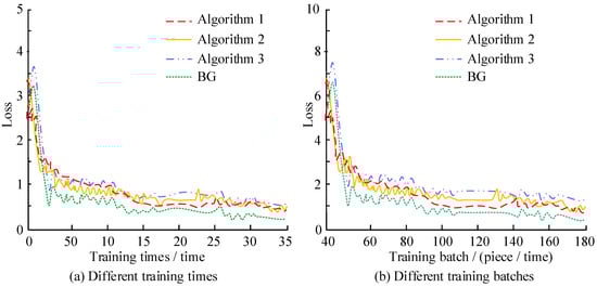 Loss value under different training times and different batches. ((a) When the training times are 20, the error convergence values of BG algorithm, belief propagation algorithm, shortest path algorithm and improved cooperative optimization algorithm are 0.456, 0.625, 0.689 and 0.721 respectively. (b) When the training batch size is 100 times, the error convergence values of the four algorithms are 0.898, 1.035, 1.234 and 1.563 respectively).
