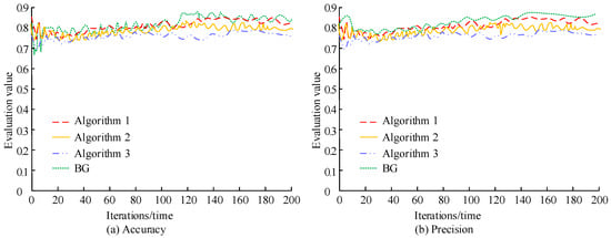 Accuracy and precision of four minimum cost maximum flows under different iterations. ((a) The BG iterative algorithm has the highest accuracy, with the stable convergence values of 88.56% respectively. The accuracy range of the other three minimum cost maximum flow algorithms is 72.36–83.24%. (b) The BG iterative algorithm has the highest accuracy and precision. The stable convergence value is 89.12%, and the accuracy range is 73.56–82.15%).