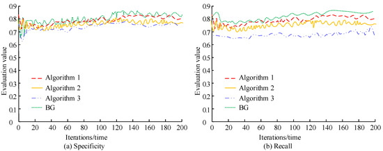 Recall rate and specificity of four minimum cost maximum flows under different iterations. (It can be seen from the figure that with the increase of iteration times, the recall rate and specificity of the four minimum cost maximum flows gradually become stable. Among them, compared with the other three minimum cost maximum flow algorithms. (a) BG iterative algorithm has the highest specificity. The stable recall rate of the other three minimum cost and maximum traffic algorithms is between 65.58% and 78.96%. (b) The specificity of the BG iteration algorithm is the highest, and the stability specificity of the other three algorithms is between 66.83% and 78.35%).