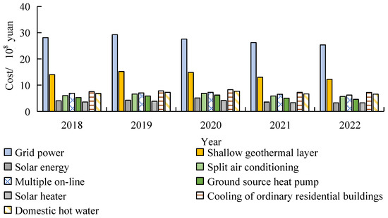Figure 9 shows the cost of energy planning for each part of the summer regional building energy planning model after applying the BG iterative algorithm. With the increase of time, the cost consumption of Shanghai’s annual energy supply layer, energy conversion layer, and energy demand layer shows a decrease year by year. As a whole, it can be seen that after the application of the BG iterative algorithm, the cost consumption of each part of the regional building energy planning model in summer will be greatly reduced, which will help to achieve a reasonable allocation of resources and make the overall energy consumption within the regional requirements.
