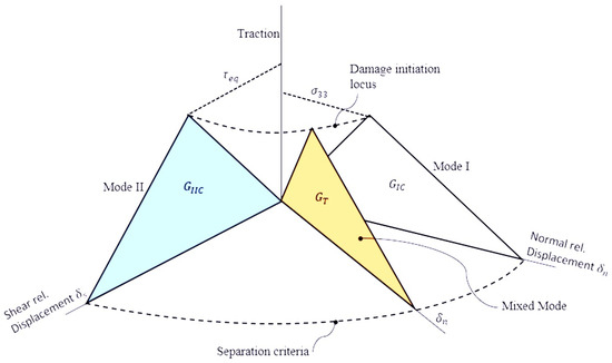 where Macaulay’s bracket ⟨ ⟩ means that only a positive quantity of the normal stress will cause damage (no damage in normal compression as it would close the crack). The shear stresses are , whereas S and N are the interface’s shear and normal strengths, respectively. This signifies that mixed-mode loading delamination onset can take place at individual stress levels smaller than the subsequent interface’s shear or tensile strength. After the onset of damage, the evolution of damage to fracture is estimated through the release rate of strain energy. When the following criteria are satisfied, the critical material point on the interface is separated [34]: