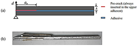 Before the bonding process, acetone was used for degreasing the surfaces of adherents. In order to make sure that the bond was uniformly thick, a spacer with 0.5 mm thickness was employed. A Teflon film (~16 µm) was placed amid the 0.5 mm polymer adhesive and the top adherend to form a pre-crack length of ao = 50. The bonded samples were exposed to 2 MPa for 15 s. The sample was dried at 50 °C for two hours. The samples were at room temperature for 24 h before testing.
