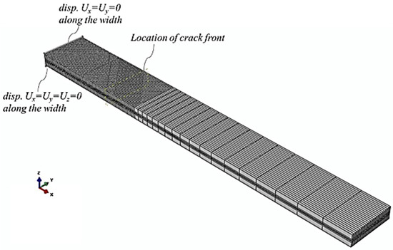 FE model for DCB specimen showing boundary conditions and element mesh.