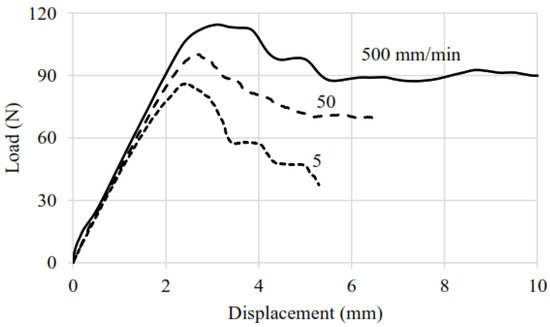 Figure 5 shows that the highest load is 85.96 N for a displacement rate of 5 mm/min, 100.07 N for 50 mm/min, and 114.46 N for 500 mm/min. It is noticeable that the reaction load increases at first. Then, the amount of energy that has accumulated continues to rise until it is the same as the energy required to initiate the spread of the fracture. Once the applied load begins to drop, it signifies that a crack is starting to extend.
