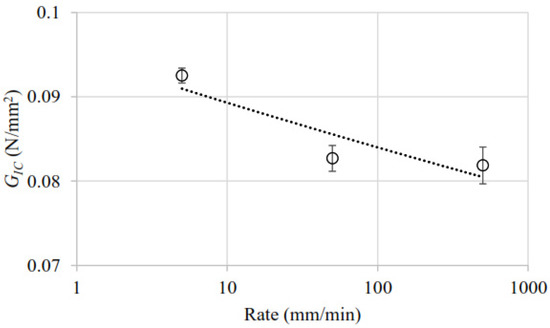 Figure 7 illustrates how the measured Mode I fracture toughness shifts for adhesively bonded joints when the crosshead displacement rate is varied from 5 to 50 to 500 mm/min. The effect of increasing strain rate on fracture energy clearly indicates that the measured fracture energy decreased as the displacement rate increased from 5 mm/min to 50 mm/min. Upon a further increase in the strain rate to 500 mm/min, the fracture energy further decreased to a lower value. This is indicated by the squeezing bilinear traction separation law, which means that the covered area beneath the curve decreases when the strain rate increases. Also, the displacement at the onset and displacement at the fracture , shift to smaller values. This means that with an increasing strain rate, less energy is required to fracture the specimen.