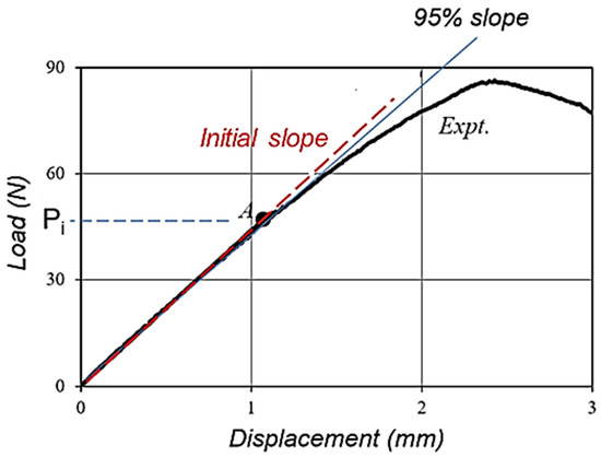 Figure 8 illustrates the load response of the DCB specimen under the Mode I loading condition when a displacement with the rate of 5 mm/min is applied. It also illustrates that the experimental curve and the simulation curve intersect in the center of the curve. Both the straight line and the experimental curve start to deviate at point A with a 5% arbitrary slope reduction. This load level is hypothesized as corresponding to damage onset in Mode I. The dashed line shows the response of a perfectly bonded interface (assuming no damage). The identical simulation process is used for all displacement rates. In addition, the plot of individual rates of displacement may be employed to determine the location where damage initiates.