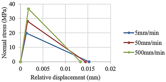 In order to quantify the influence of strain or loading rate on the damage process of the adhesive joints, it is essential to take into account the changes that were measured in the parameters of stiffness and strength. This effect can be observed by taking into account the usual traction–displacement law for various straining effects, as shown in Figure 2. With higher rates, the area under the curve (representing the strain energy release rate, GIC) lowers as the penalty stiffness (kn) and tensile strength (N) grow. Thus, Equation (1) predicts a later damage initiation event, while Equation (2) predicts a more rapid damage evolution as a result of the decreased toughness. For the shear traction–displacement reaction, it is expected that similar effects will occur. This indicates that the contact has a response similar to brittleness when subjected to a high strain rate.
