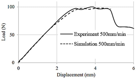 The same FE model used in previous discussions is demonstrated again to validate the interface properties. Similar methods are practiced for the validation of model and simulation processes in previous works [2,7,10,38]. The reaction of the interface is controlled by the bilinear traction–separation law. This study, through FEA, seeks to determine the impact of a varied displacement rate on adhesive joints. It is established how strain rates influence the deformation of structures. To verify this information, the FE simulation method used a fracture mechanism of the adhesive-bonded interface to demonstrate the internal states’ responses. Figure 12 compares the FE-calculated and experimental results for the displacement rate of 500 mm/min. The good agreement of the results verifies the employed technique and the model parameters.