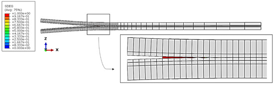 Figure 14 shows the damage to the interface through the FE-calculated result, which displays the damage initiation variables (QUADSCRT). The damage initiation variable (QUADSCRT) is calculated using Equation (1) by FE software, as shown in Figure 14a. It shows that a value of this damage variable equal to 1 means the damage has been initiated. It has been shown that the mechanism of failure at the interface of DCB specimens is governed by the equivalent tensile stress. Figure 14b shows the damage variable (SDEG) calculated by Equation (2). This variable with a value of 1 shows that the material point is separated, i.e., full fracture energy has been dissipated. The crack advances from the crack front towards the middle. This is because of the traction-free edge effect. As the material separates, the amount of tensile stress gradually goes to zero. The collection of these separated material points shows the progressive damage of the adhesive interface.