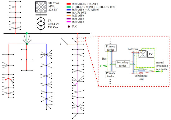 - the LV network has static topology and is connected to a 22 kV MV system through two winding 22/0.4 kV 250 kVA DETC power transformers;