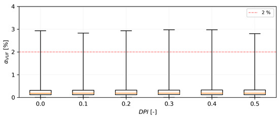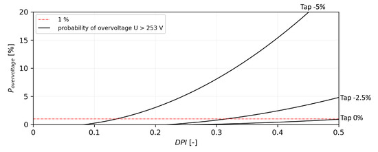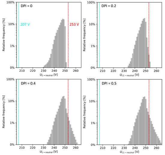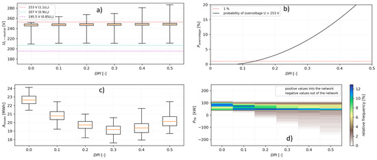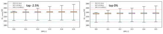 - A box plot of voltage distribution for increasing DPI. In the case with no PV in the system, all values are within the voltage limit range. Increasing DPI does not cause undervoltages.