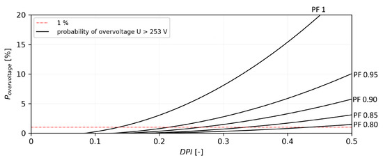 - CDF calculated for overvoltage in the network. PVHC defined by 1% probability of overvoltage is 13.6%. This is equal to the sum of 79.9 kW installed PV systems in the network. Continuous CDF was calculated from discreet data using a second-degree polynomial fit. In all CDF calculations, the residual sum of squares (RSS) is below 0.002.