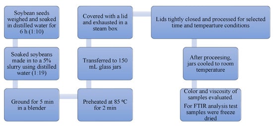 Several glass jars (Travelagn, MODEL-TRAVEL-016, Available online: Amazon.com (accessed on 5 December 2022)) were filled with 150 mL of 5% soy slurry at 85 °C, placed in an exhaust box to remove the headspace air and sealed with the specific lid supplied by the manufacturer. These were then placed inside home canning equipment (Instant Pot Max Programmable Pressure Cooker, 1100 W) and processed to specific time and temperature conditions, as detailed later. The Instant Pot cooker used in the study works similarly to a batch steam vertical retort in operation. Steam is produced by an electrical heating element in contact with a specified amount of water filled up to an indicated level in the cooker, and the glass jars are placed on a rack above. The equipment is fitted with a pressure valve that relieves excess pressure once the desired set point temperature is reached. Depending on the size of the glass jars, four to twelve jars could be processed at a given time. In this study, four soy slurry-filled glass jars were processed with each run. The process was replicated three times.