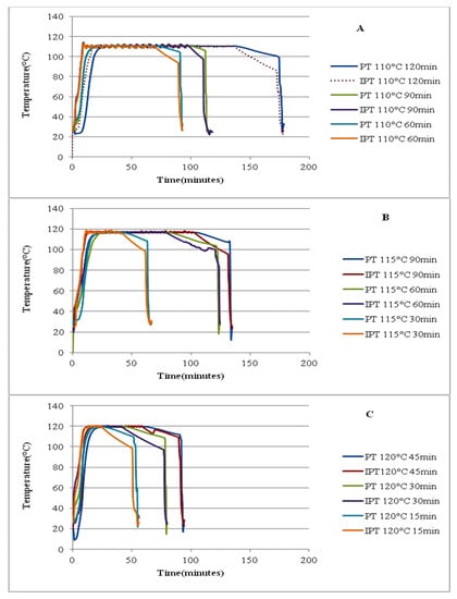 Time–temperature profile of thermal processing performed at (A) 110 °C, (B) 115 °C and (C) 120 °C at different time intervals.