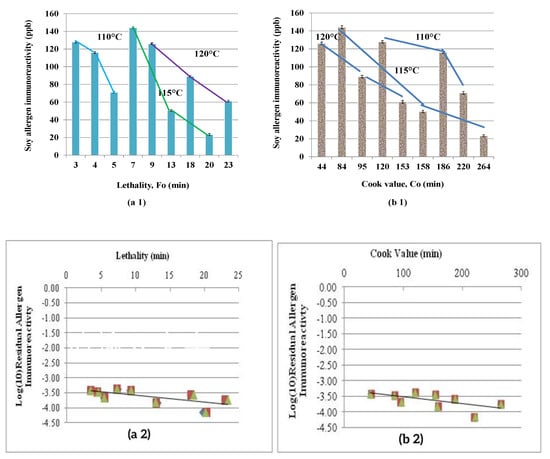 Because of some of the overlaps with respect to the influence of different process variables on the treatment performance, the general trends with respect to the influence of process parameters on soy IR reduction are not clear. These are shown in Figure 3 as a function of process lethality and cook value with allergen IR activity in terms of residual allergen concentration (ppb) and logarithmic reductions. At each temperature, a longer treatment time (i.e., higher Fo and Co) consistently resulted in lowering the IR level. Figure 3 also gives an excellent demonstration of the precision of the measurement method, indicating that the method was sensitive enough to detect differences even at 10–100 ppb levels. The decrease in allergen concentration at higher lethality and cook values can be due to the change in the structural denaturation and breakdown of allergen proteins by the effect of high temperatures and processing times []. The general semi-logarithmic change in a reduction in IR of soy allergens with lethality and cook values is clearer. There appears to be considerable spread, but the general trend within the range of values under the treatment conditions shows a log-linear relationship between IR reduction and lethality and cook values.