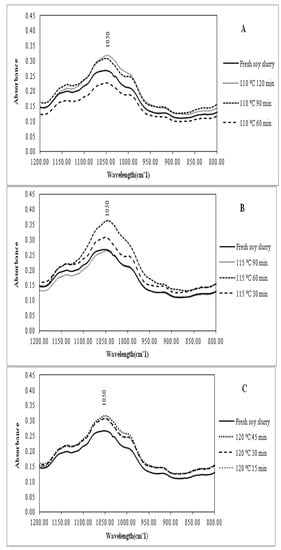 FTIR normalized spectra (1200–800 cm−1) of soy slurry samples processed at (A) 110 °C, (B) 115 °C and (C) 120 °C.