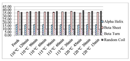From Figure 5, it is clear that the main secondary structure of fresh soy slurry (5%) was found to be β-sheet and random coil, followed by α-helix and β-turn. After intense thermal processing, all soy slurry samples showed a decrease in the percentages of α-helix and β-sheet and a marginal increase in β-turn and random coil. By analyzing the content of the secondary structure of samples, there was, moreover, an unusually large value for random coil or disordered (1639–1654 cm−1) than α-helix (1642–1660 cm−1) and β-turn (1653–1691 cm−1) content even in fresh soy slurry.