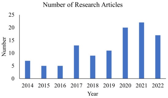 Figure 2 illustrates the number of articles that have been obtained after applying the PRISM framework. Here, it represents the number of articles that have been selected year-wise, such as 2014–2022. There are 9 articles from the years 2001, 2008, 2009, 2012, and 2013, and one reference is a web link. Of the remaining articles, 108 are from the years 2014–2022. The details of articles year-wise are presented: 2014 (5%), 2015 (4%), 2016 (4%), 2017 (11%), 2018 (7%), 2019 (9%), 2020 (17%), 2021 (19%), and 2022 (14%).