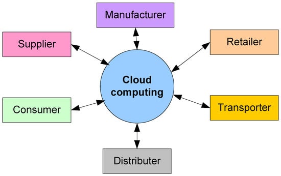 The main reasons that small and medium enterprises (SMEs) choose to use the cloud are its simplicity and convenience. The second reason that SMEs choose the cloud after cost savings is improved security and privacy. As a result, they can use ERP, CRM, SCM, etc.—applications that would be exceedingly costly to operate internally [39]. It was discovered that cloud computing technology has enormous promise in delivering effective collaboration solutions in precast construction [40]. The emergence of cloud computing presents the clear potential to enhance the sharing of information, allow the better utilization of modern analytical methods, and better control security and limited access [41]. Figure 6 depicts all the stakeholders connected in the supply chain cloud. They can share information and resources among themselves. As discussed earlier, the cloud server empowers participants to connect physical items in the virtual world through communication protocols. Table 1 provides the recent studies on the implementation of IoT for sustainable SCM.