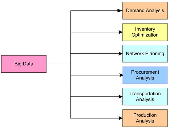 Big data is a popular enterprise system or platform that appears to provide additional functions for gathering, storing, and analyzing massive amounts of generated data from various sources to achieve value addition [47]. SCM, which provides a fertile environment for big data production, collects massive amounts of data from a variety of operations, such as the use of sensors, RFID, and tracking devices. The concept of big data contributes to increased visibility and risk reduction. SC disruption and failures are avoided by providing an integrated framework for monitoring customer performance and engagement through the analysis of real-time data and critical decision-making scenarios [48]. The prevalence of mobile computing and the amount of data produced have created new opportunities for process improvement, as well as new gateways for monitoring demand, enhancing problem understanding, and making plans [49]. The results show how demand management, vendor rating, IoT, analytics, and data science have an impact on operational excellence, cost savings, customer satisfaction, visibility, and closing the communication gap between demand management and SC management. Big data technology adoption can result in significant value addition and financial gains for businesses and will soon become the norm in the sector [50].