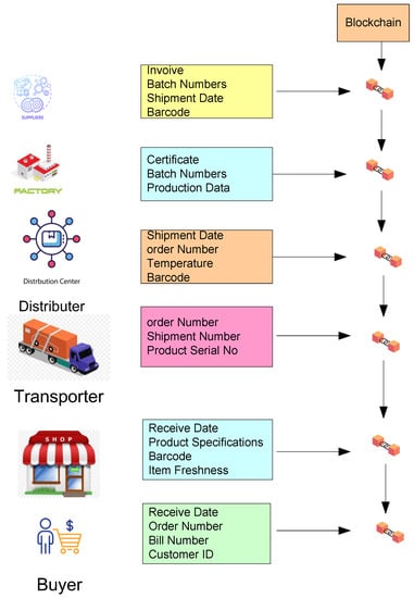 In the modern era of technology, almost all company models have been experiencing significant upheavals as a result of ongoing advances in cutting-edge information and communication technology (ICTs) [71]. The blockchain is a well-known and extremely disruptive technology that is already changing well-established business models and opening up new possibilities throughout the whole SC. Blockchain often refers to a completely distributed system of cryptography for recording and storing a linear event log of networked actor interactions that is consistent and immutable [72]. A system called blockchain was developed to conduct transactions in the digital currency market [56,57,58]. Blockchain applications have already attained a high level of authority in the financial industry but have recently been expanded to domains such as operations and SC management. It is viewed as a paradigm that presents both a crucial issue and an opportunity. For example, blockchain has the potential to significantly increase security, efficiency, accountability, and trust, as well as reduce costs [73]. Additionally, blockchain is thought to be able to solve SCM traceability problems [74] and aid in fostering more intimate and reliable relationships [75,76], not only between companies and their suppliers but also within SCM as a whole. On the one hand, a decentralized, blockchain-enabled smart contract has the potential to significantly increase SCM’s efficiency. On the other hand, blockchain can be used in conjunction with other cutting-edge technologies to exert a disruptive effect in all specialized domains [77].