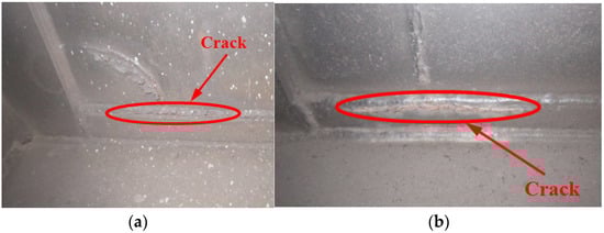 (a) The crack on cross bearer weld of 70t gondola car body; (b) The crack on cross bearer weld of 80t gondola car body.