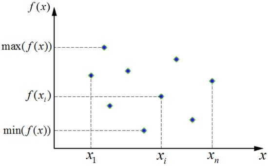 When monotonically increasing or monotonically decreasing independent variables, any point on the coordinate axis can be transformed into values between [−1, 1]. Two-dimensional space can be taken as an example in this paper. In such an instance, the coordinate origin is taken as the symmetry center, and the asymmetry coefficient is used to evaluate the symmetry degree of the independent variable, as shown in Figure 2. The calculation methods of and are similar, and the calculation method of the asymmetry coefficient is as follows: