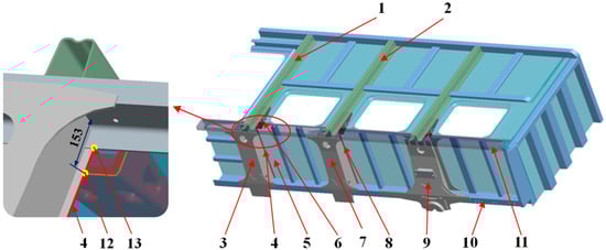 The structure of 80t gondola car body: 1. side column 1; 2. side column 2; 3. cross bearer 1; 4. cross bearer weld 1; 5. floor; 6. interior reinforcement; 7. cross bearer 2; 8. cross bearer weld 2; 9. bolster beam; 10. center sill; 11. side sill; 12. intersection point between cross bearer weld 1 and interior reinforcement (The distance between the intersection point and the side sill is 153 mm); 13. starting point of cross bearer weld 1.