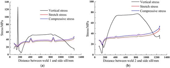 - According to Figure 8b, compared with the stress distribution cluster of weld 1, the stress of weld 2 is high between 400 mm and 850 mm, and it is relatively small at 153 mm. Compared with weld 1, there are two main reasons for this phenomenon: the center difference of side column, interior reinforcement and cross bearer is small; the weld 2 is far away from the center of the car body.
