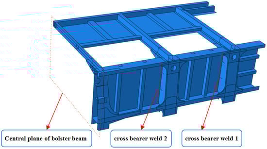 The 80t gondola car body is an all-steel welded structure, which is shown in Figure 4, and the literature [] gives an introduction to its structure in detail. In order to facilitate the description, cross bearer 1 and side column 1 are defined, and these are associated with cross bearer weld 1. Then, cross bearer 2 and side column 2 are defined, which are associated with cross bearer weld 2. For ease of expression, “cross bearer weld 1” is abbreviated as “weld 1”; “cross bearer weld 2” is abbreviated as “weld 2”.