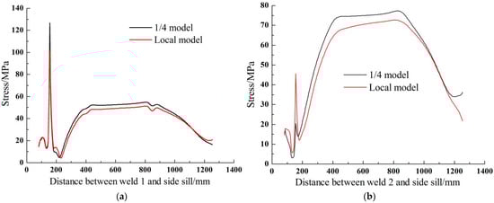 Contrast graphics of stress distribution between local model and 1/4 model. (a) weld 1, (b) weld 2.