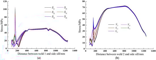 According to the simulation results, the stresses of the cross bearer welds are extracted, which start from intersection points. The stress distribution of welds under each condition is shown in Figure 5.