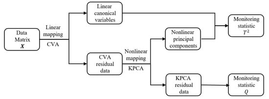 From Figure 1, the linear canonical variables and CVA residual data are obtained through the CVA model. Then, the CVA residual data are further investigated to dig the nonlinearity of the process. Given a dataset , , a nonlinear mapping maps from the original space to a high-dimensional linear space F. The corresponding covariance matrix is calculated as
