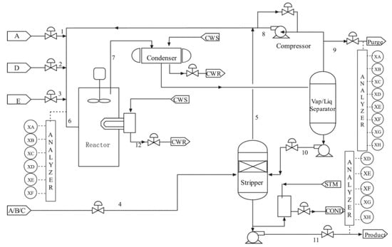 The TE process [23,24] is the benchmark process shown in Figure 3. The TE production process consists mainly in the reaction of four gaseous materials, producing two products and a by-product. There are 52 variables in the whole TE process. A total of 20 faults are used for verification, including 4 types of different faults, respectively, step, random, slow drift and sticking. Moreover, there are five faults whose fault types are unknown. The corresponding data can be found in [25]. Training datasets and testing datasets all consist of 960 samples. The fault dataset contains 160 normal samples and 800 fault samples.