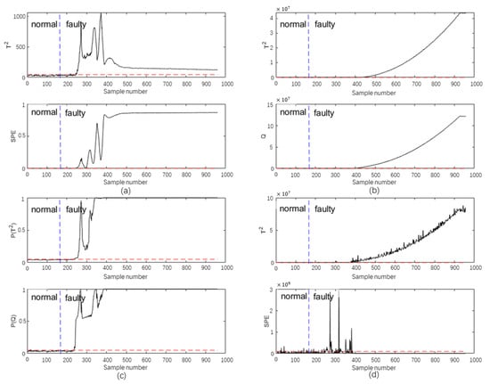 For online monitoring, the and Q statistics at each sampling instant can be obtained by Equations (14) and (15). If one of or Q exceeds its upper control limit or , a fault is detected.