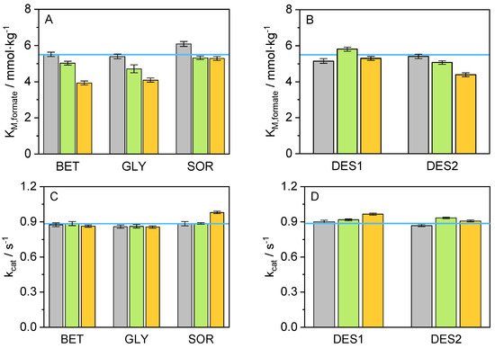 From Figure 2 and Table S1, it is possible to distinguish a decrease in the values for K with increasing co-solvent concentration, compared to the neat buffer environment. This decrease could be interpreted as an improvement in the affinity of cbFDH towards the formate when the co-solvent is present in the cbFDH environment. It is known that osmolytes could interact favorably with water, enriching the hydrogen bond network in the cbFDH vicinity. Nevertheless, SOR represents an exception to this trend since adding it had practically no significant effect on K, regardless of SOR concentration, probably due to solvent structure limitations. Further, the values for k, in contrast to K, show slight negative changes for BET and GLY and a small improvement in the presence of SOR and DES systems. Interestingly, non-monotonic behavior is observed for DES2. Finally, with the help of the relation between k and K, it was possible to determine the catalytic efficiency (K); this measure provides an insight into the overall performance of a cbFDH for a specific reaction and substrate. The effect of the co-solvents used in this work on the catalytic efficiency is shown graphically in Figure 3.