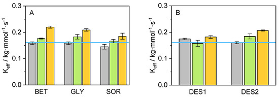 Values for K obtained from the ratio between k and K in the presence of (A) various co-solvents and (B) in presence of DES on the reaction medium (T = 25 °C, p = 1 atm, pH = 8.5) at different concentrations (grey: 5 wt.-%, green: 10 wt.-%, orange: 15 wt.-%, and blue line: neat buffer).