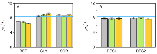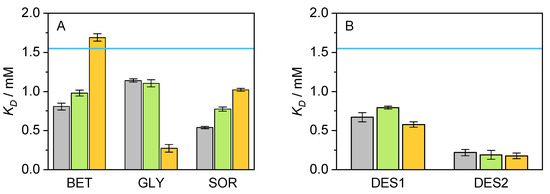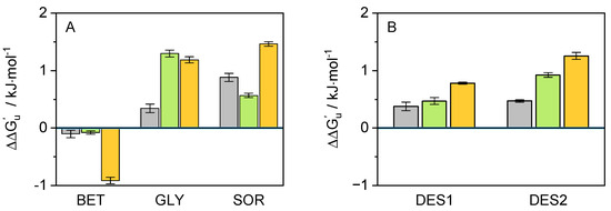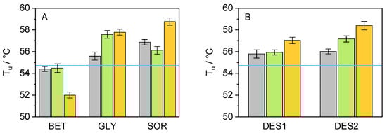 Knowledge of this is essential since it describes how thermally stable the enzyme’s folded state is in the respective co-solvent compared to the buffer. This value could be related with other thermodynamic properties such as B (cf. Figure S4). As shown in Figure 5, the results for correlates with the T results. This confirms the conclusions drawn after the interpretation of Figure 4, i.e., adding the considered co-solvents seems to provide the cbFDH with greater thermal protection compared to neat buffer, and it can be improved with increased concentration. BET was the only co-solvent that resulted in negative values for , regardless of its concentration in the solution. The non-monotonous effect of SOR concentration on thermal stability is worth mentioning as hydrogen bond dynamics between cbFDH/co-solvent/water change dramatically with the amount of water. In contrast, DESs cause linear increases in thermal stability, which are mainly caused by the additive effects of the DESs constituents, i.e., GLY and SOR compensate for the destabilization effect of BET.