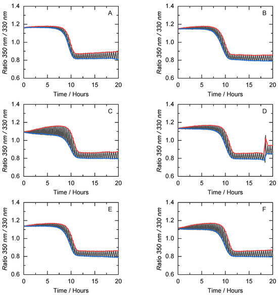 Unfolding (blue) and non-reversibility (red) curves of cbFDH obtained from the MSF measurements in (A) buffer and under the influence of various co-solvents at 10 wt.-% concentration ((B): BET, (C): GLY, (D): SOR, (E): DES1, and (F): DES2) at pH = 8.5 and p = 1 atm. Here, the fluorescence ratio of 350 nm to 330 nm is plotted against the time. x-axis correlates to the temperature during the measurement (between 20–80 °C).