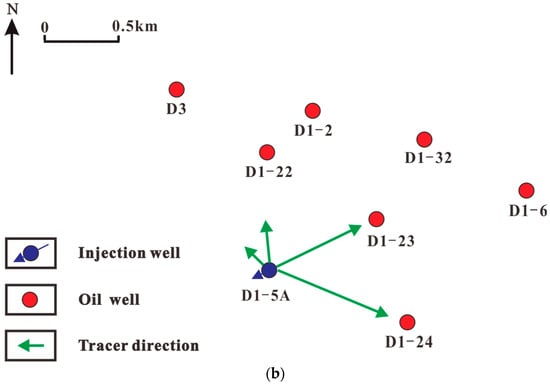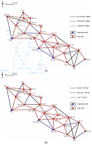 Therefore, based on the theory of inter-well connectivity [], this paper will apply the method to multi-layer sandstone reservoirs. Through the characteristic production and development parameters of D reservoir in Chad, a multi-layer inter-well connectivity model is constructed to finely characterize the injection–production relationship between multi-layer injection wells and production wells in the study area. Using field tracer data to analyze and adjust the inter-well conductivity and connectivity volume values, the inter-well connectivity field is obtained in real-time. Finally, according to the average water injection efficiency of the water injection wells in the study block, each water injection well is divided into high-efficiency wells and low-efficiency wells. Through the optimization algorithm, the optimal control of the injection volume of the water injection well is realized, and the purpose of controlling water-increasing oil and identifying the dominant channel of the reservoir is achieved.