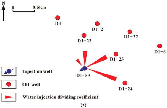 The results of the splitting coefficient calculated by this model are compared with the actual field tracer water injection monitoring, as shown in Table 1 and Figure 4. The tracer response of the injection well D1-5A was mainly monitored in wells D1-23, D1-24, D1-22, and D3. The water flooding velocity in each direction can be inferred by the distance between the injection well and each production well and the effective time of tracer monitoring. At the same time, combined with the water injection splitting coefficient, it can be concluded that the fastest tracer monitoring response is that the water flooding speed of the D1-24 well is 84.2 m/d, and the water injection splitting coefficient is 31%, which is the highest among the four production wells. The second is well D1-23; the water flooding speed is 42.7 m/d, and the water injection splitting coefficient is 26%. The water injection splitting coefficient of well D1-22 and well D3 is consistent with the actual monitoring data of the tracer field. Among them, the tracer monitors the wells with faster water flooding speed, and the corresponding water injection splitting coefficient is larger, which fully verifies the accuracy of the model.