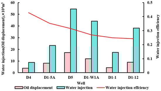 (2) Efficiency evaluation and analysis of water injection wells: If the injection well , then it is judged that the water injection efficiency is high and the injection needs to be increased. On the contrary, if , then the water injection efficiency is low, and the water injection needs to be reduced. After optimization, the water injection volume of each layer of the water injection well is as follows: