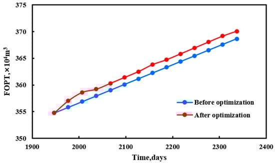 According to the adjustment of production optimization, the cumulative oil production in the study area increased from  m3 to  m3, and the oil production increased by  m3. The moisture content decreased from 53.3% to 50.7%, a decrease of 2.6%, as shown in Figure 6 and Figure 7.